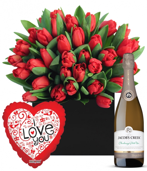 Sophisticated red Tulips with a Valentine's Balloon and Jacobs Creek Sparkling Wine, the perfect start to a great Valentine's Day