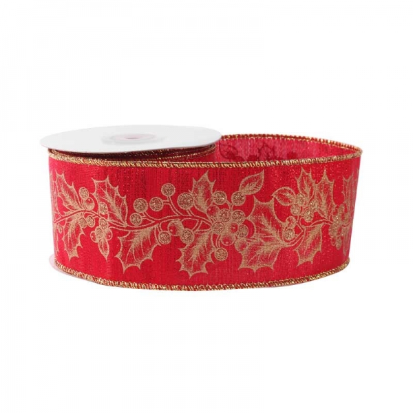 Red with Gold Holly Ribbon (63mm x 10yds)