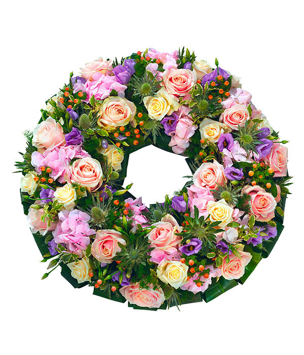 A pretty pastel wreath. Pink and cream Roses, pink Hydrangea and Hypericum are mixed with purple Lisianthus and white Eryngium.